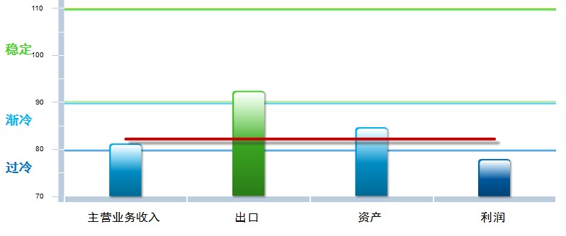 分项景气指数中,出口、资产、利润景气指数环比小幅回升,主营业务收入指数下降,其中:主营业务收入景气指数81.23,位于“渐冷”区间,较上月下降0.52点;出口景气指数为92.42,位于“稳定”区间,较上月上升3.89点;资产景气指数为84.67,位于“渐冷”区间,较上月上升0.04点;利润景气指数77.92,位于“过冷”区间,较上月回升0.28点。