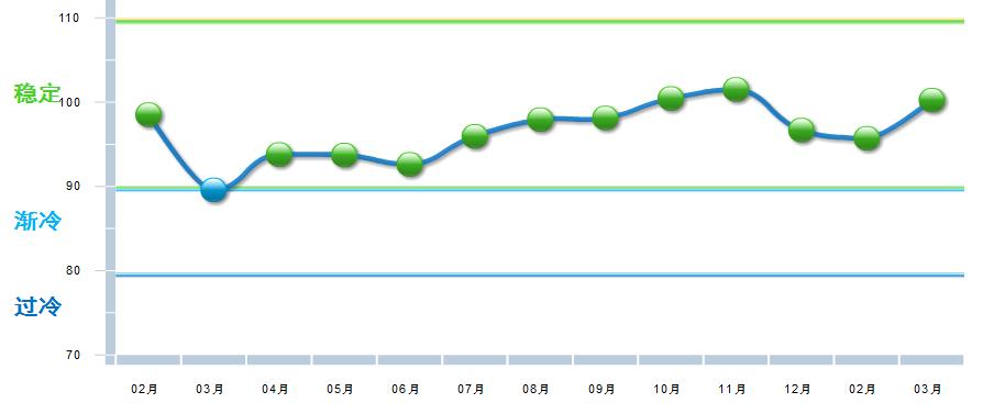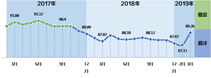 中国轻工业经济运行及预测预警系统数据显示:2019年开年,中轻景气指数继续在蓝色“趋冷”区间波动,由于春节错月因素影响,一季度