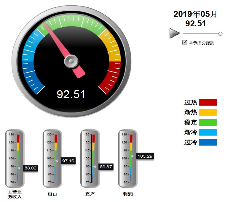 分项指数中,资产、利润景气指数环比4月回升,营业收入、出口景气指数环比下降。其中:营业收入景气指数88.02,位于“渐冷”区间,较4月下降1.08点;出口景气指数为97.16,位于“稳定”区间,较4月下降0.91点;资产景气指数为89.87,位于“渐冷”区间,较4月回升0.9点;利润景气指数103.29,位于“稳定”区间,较4月回升4.95点。