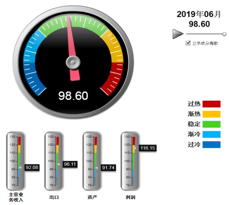 四项分项指数环比上月均有下降,利润景气指数降幅较大。其中:营业收入景气指数92.08,位于“稳定”区间,较5月下降0.41点;出口景气指数为96.11,位于“稳定”区间,较5月下降2.02点;资产景气指数为91.74,位于“稳定”区间,较5月下降1.4点;利润景气指数116.15,位于“渐热”区间,较5月下降25.28点。