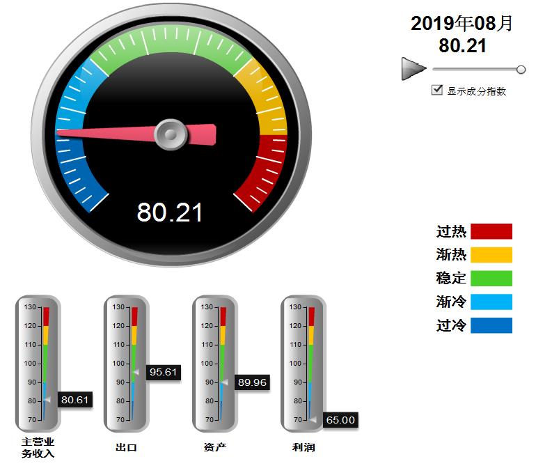 分项指数中,利润景气指数环比上月低位回升,营业收入、出口、资产景气指数环比下降:营业收入景气指数80.61,位于“渐冷”区间,较7月下降1.08点;出口景气指数为95.61,位于“稳定”区间,较7月下降8.66点;资产景气指数为89.96,位于“渐冷”区间,较7月下降0.14点;利润景气指数65.00,位于“过冷”区间,较7月上升1.48点。