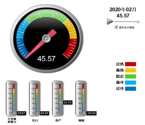 分项景气指数中,资产景气指数小幅上升至“稳定”区间,营收、出口、利润景气指数均较上年末大幅下降,其中:营业收入景气指数59.67,位于“过冷”区间,较上年末下降28.01点;出口景气指数为64.84,位于“过冷”区间,较上年末下降26.15点;资产景气指数为91.74,位于“稳定”区间,较上年末下降2.36点;利润景气指数-24.83,位于“过冷”区间,较上年末下降110.77点。