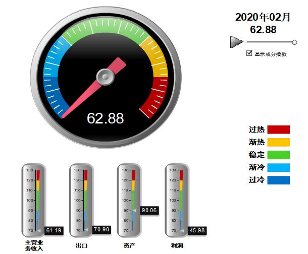 四项分项景气指数均较上年末下降,利润景气指数降幅较大,其中:营业收入景气指数61.19,位于“过冷”区间,较上年末下降23.94点;出口景气指数为70.90,位于“过冷”区间,较上年末下降18.73点;资产景气指数为90.06,位于“稳定”区间,较上年末下降1.2点;利润景气指数45.98,位于“过冷”区间,较上年末下降42.58点。