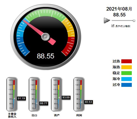 分项景气指数中,营收、利润指数环比下降,出口、资产指数均有回升,其中:营业收入景气指数91.19,位于“稳定”区间,环比下降0.09点;出口景气指数为80.77,位于“渐冷”区间,环比上升12.8点;资产景气指数为93.09,位于“稳定”区间,环比上升0.26点;利润景气指数83.53,位于“渐冷”区间,环比下降0.96点。