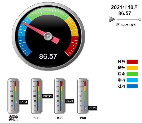分项景气指数中,出口、资产指数环比小幅上升,营收、利润指数均有下降,其中:营业收入景气指数87.64,位于“渐冷”区间,环比下降0.17点;出口景气指数为100.64,位于“稳定”区间,环比上升5.89点;资产景气指数为90.21,位于“稳定”区间,环比上升0.53点;利润景气指数75.28,位于“过冷”区间,环比下降2.24点。