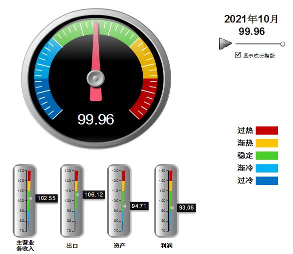 分项景气指数中,出口指数环比小幅上升,营收、利润、资产指数均有下降,其中:营业收入景气指数102.55,位于“稳定”区间,环比下降1.35点;出口景气指数为106.12,位于“稳定”区间,环比上升0.07点;资产景气指数为94.71,位于“稳定”区间,环比下降0.64点;利润景气指数93.06,位于“稳定”区间,环比下降2.17点。