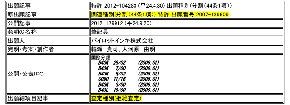 此后,在得到审判决定后,百乐墨水株式会社又在特願2007-139609的基础上另外提出了1件分案申请,即特願2012-104283,该分案申请也已经被驳回: