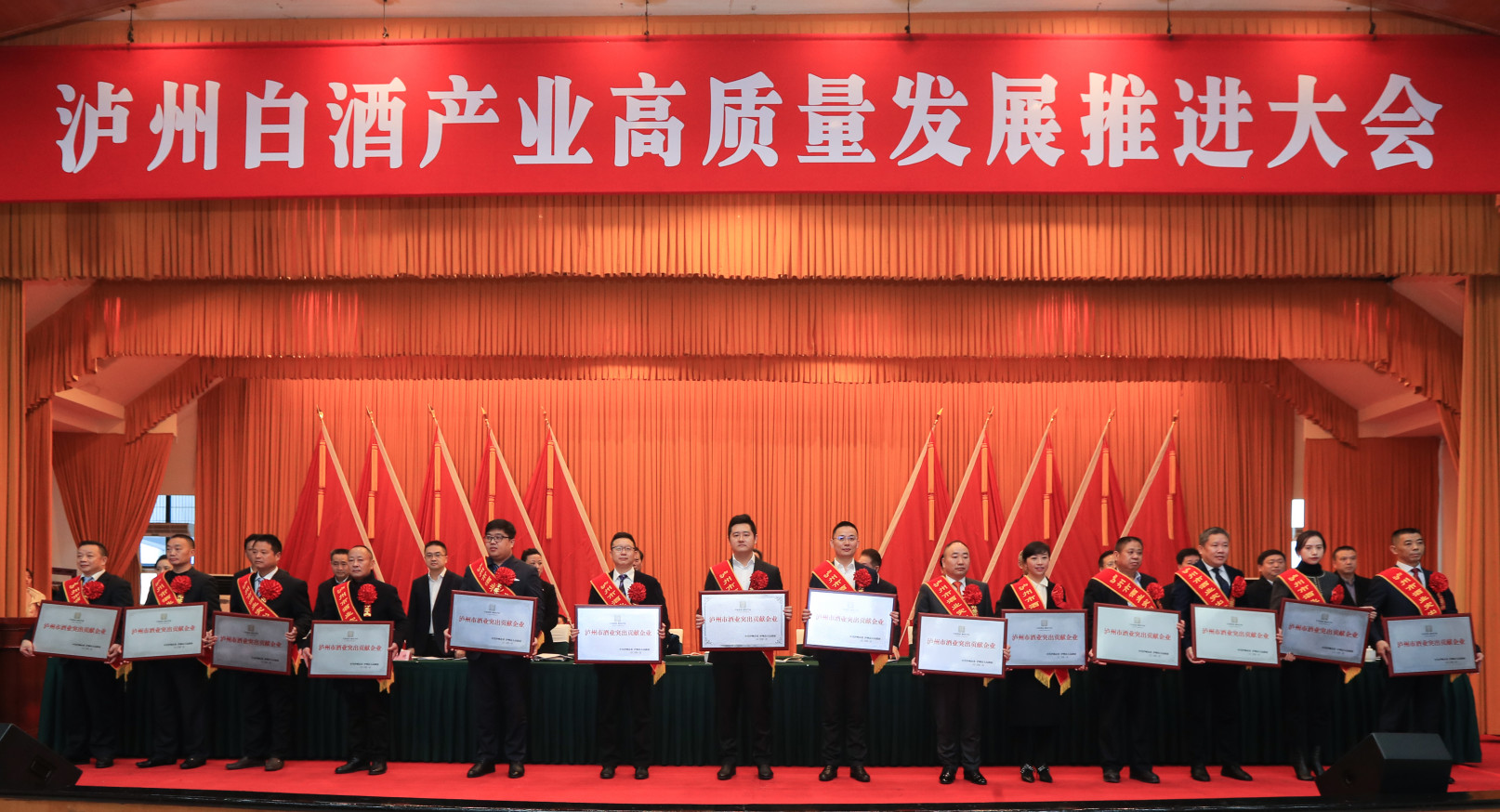 会议为泸州老窖股份有限公司等3户特别贡献企业和四川泸州三溪酒类(集团) 有限责任公司等26户突出贡献企业颁发了奖牌。