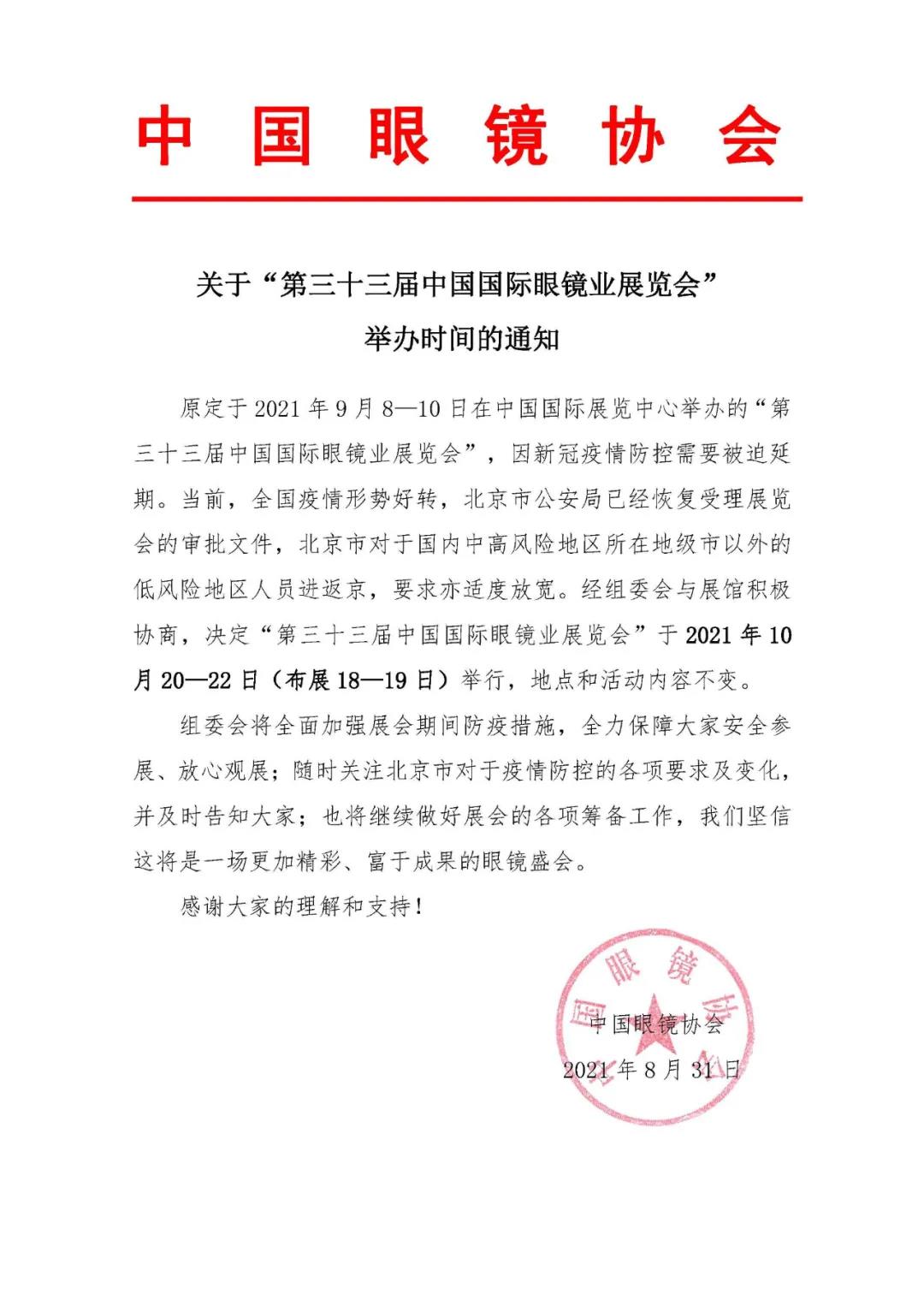 关于“第三十三届中国国际眼镜业展览会”举办时间的通知