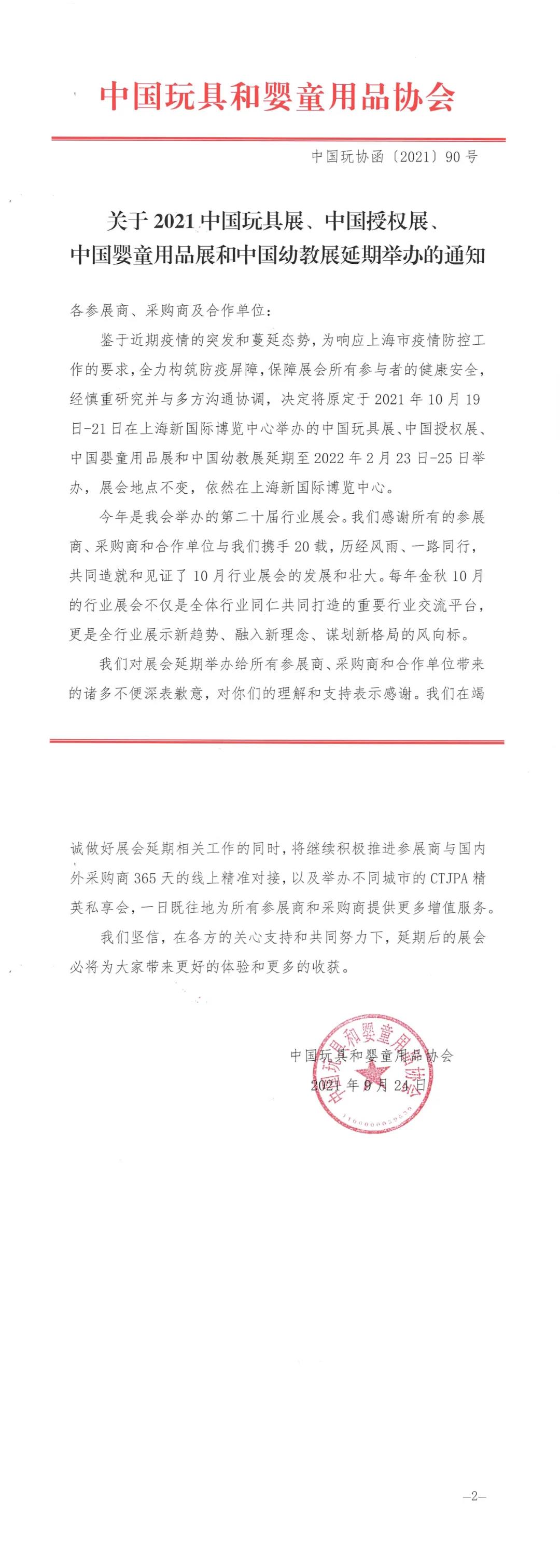 鉴于近期疫情的突发和蔓延态势,为响应上海市疫情防控工作的要求,全力构筑防疫屏障,保障展会所有参与者的健康安全,经慎重研究并与多方沟通协调,决定将原定于2021年10月19日-21日在上海新国际博览中心举办的中国玩具展、中国授权展、中国婴童用品展和中国幼教展延期至2022年2月23日-25日举办,展会地点不变,依然在上海新国际博览中心。通知全文如下: