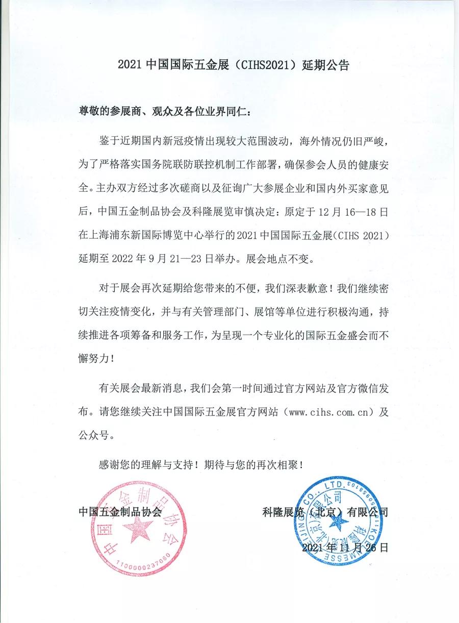 鉴于近期国内新冠疫情出现较大范围波动,海外情况仍旧严峻,为了严格落实国务院联防联控机制工作部署,确保参会人员的健康安全。主办双方经过多次磋商以及征询广大参展企业和国内外买家意见后,中国五金制品协会及科隆展览审慎决定:原定于12月16—18日在上海浦东新国际博览中心举行的2021中国国际五金展(CIHS 2021)延期至2022年9月21—23日举办。展会地点不变。