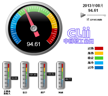 发布2013年8月中轻家具景气指数。8月,中轻家具景气指数94.61,其中:主营业务收入景气指数为92.89,出口景气指数为101.65,资产景气指数为103.52,利润景气指数为89.77(图1)。