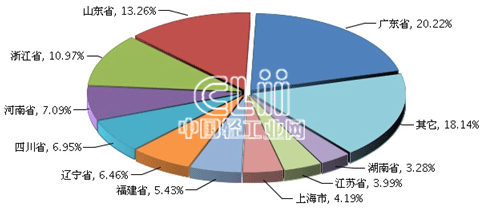 1~7月,家具行业累积主营业务收入居全国前10位的地区中,只有河南超过四川列第四位,其他8个地区的排名不变;广东、山东和浙江依旧稳居前三位,其中,广东的累计主营业务收入(下同)占20.22%;山东占13.26%;浙江占10.97%(图6)。