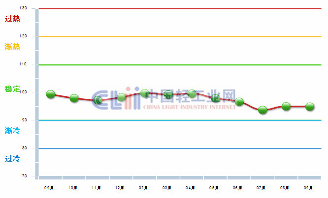 发布9月中轻日化景气指数。9月,中轻日化景气指数为94.87,处于绿色稳定运行状态。分项指数中,本月主营业务收入景气指数为93.38,出口景气指数为94.27,资产景气指数为100.50,利润景气指数为97.57(见图1-1)。