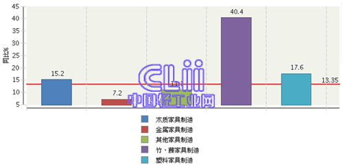 图5 2013年1~8月家具子行业规模以上企业累计主营业务收入增速情况