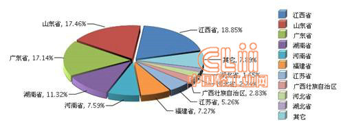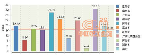 2013年1~10月全国陶瓷行业累计完成主营业务收入前三位地区分别是江西、山东、广东,其中江西继7月份首次超越山东、广东之后,继续保持首位,累计完成主营业务收入同比增长19.49%,占18.85%;山东同比增长8.56%,占17.46%;广东同比增长17.24%,占17.14%。湖北、河南、福建、广西等地区累计同比增速居前,同比增长均在20%以上。详见图2、3。