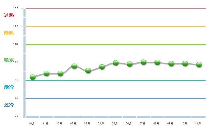 2012年同期,五金行业利润景气指数一直停留在“渐冷”区域。2013年五金利润景气指数呈明显上升趋势,并一直保持在稳定区。11月指数为98.53,较上月略有下降(如图)。