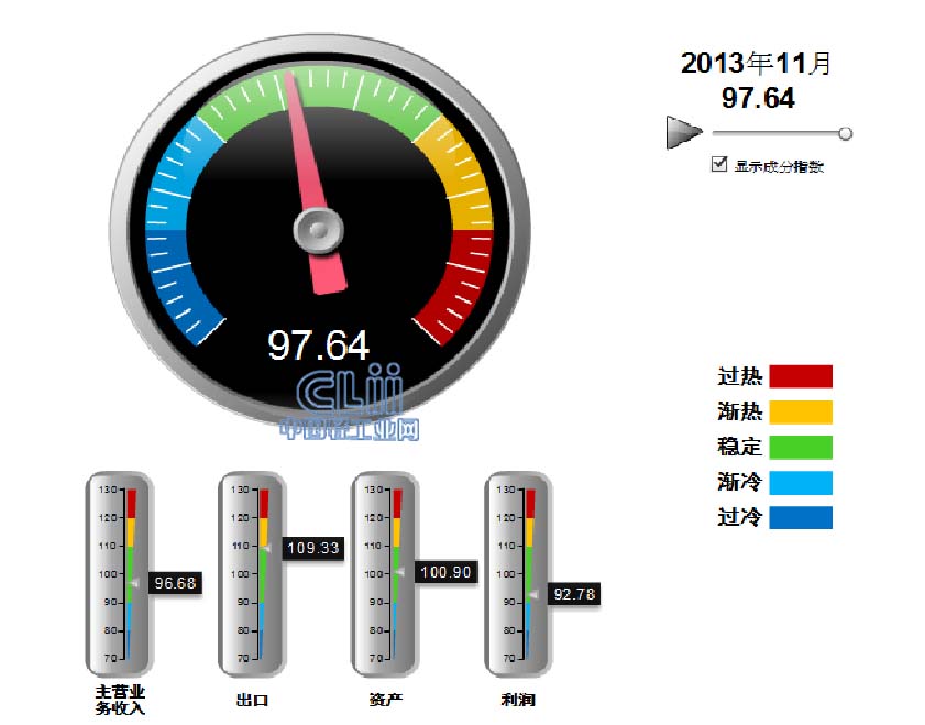 发布2013年11月中轻照明景气指数。11月,中轻照明景气指数97.64,其中:主营业务收入景气指数为96.68,出口景气指数为109.33,资产景气指数为100.90,利润景气指数为92.78(图1)。