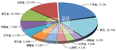 图6 2013年1~11月主要地区家具行业规模以上企业累计主营业务收入占比情况