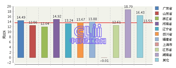 图7 2013年1~11月主要地区家具行业规模以上企业累计主营业务收入增速情况