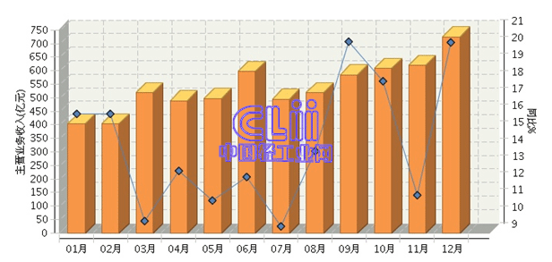 2013年,家具行业规模以上企业(下同)的累计完成主营业务收入占轻工全行业累计主营业务收入的3.18%,同比增长14.30%。从家具行业的月度主营业务收入来看,运行轨迹与往年相似,呈现上半年震荡上行,下半年逐月攀升的态势,12月创历年新高,然而各月增速波动较大,最高增速与最低增速相差10.94个百分点(图2和图3)。