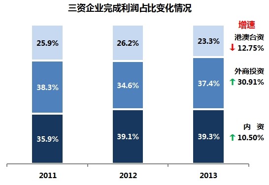 从三年三资企业完成利润总额占比看,从2012年开始,内资企业占比反超外资企业,但是由于外资企业2013年利润实现30.91%的高速增长,内外资企业占比差较2012年有所缩小;港澳台资企业本年完成利润出现12.75%的负增长。