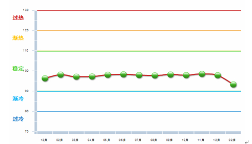 2014年2月中轻五金行业景气指数继续保持在“稳定”区间内运行,较2013年12月有明显的下降,已经快趋近于“稳定”区与“渐冷”区的边界值(图2)。