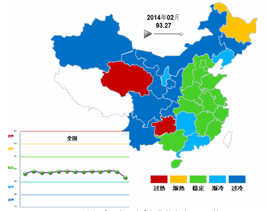 从分地区五金行业景气指数看,与2013年12月份相比有所变动:青海和贵州两地区仍处于“过热”区;黑龙江省继续处于“渐热”区;云南省由过“渐热”区变为了“过冷”区,新疆和四川两地区由“渐冷”区变为了“过冷”区,此外,吉林、内蒙、陕西、重庆几地区也都处于“过冷”区,“过冷”区明显分布在我国中西部地区;湖南、广东、宁夏和辽宁四地区均处于“渐冷”区,其它大部分地区均处于“稳定”区,此区域主要集中在我国东部地区(如图)。