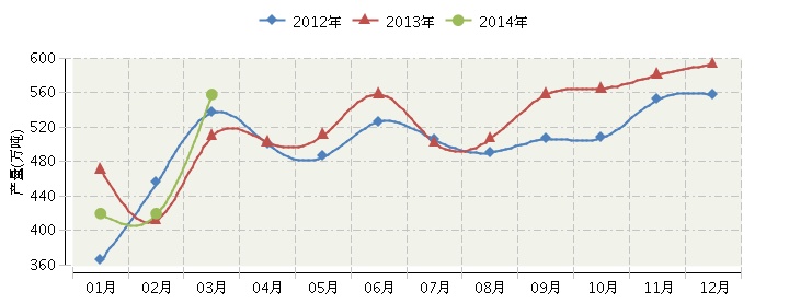 2014年全国塑料制品连续三年月度产量对比