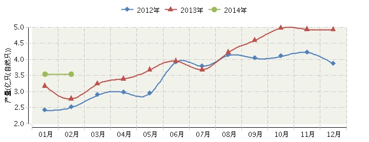 根据国家统计局公布数据,2014年1~2月,全国锂离子电池行业累计完成产量7.08亿只(自然只),同比增长12.68%。2014年全国锂离子电池行业连续三年月度产量对比如下图所示。