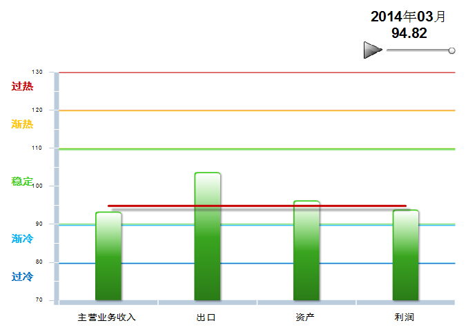 和中国皮革工业协会联合发布2014年3月中轻皮革景气指数。3月份中轻皮革景气指数94.82,较2月的93.65略升1.17个百分点。其中:主营业务收入景气指数为93.33,出口景气指数为103.72,资产景气指数为96.29,利润景气指数为93.86(参见图1、2)。