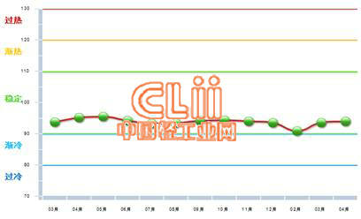 从近一年走势看,中轻陶瓷景气指数一直运行在稳定区间,但自2013年11月以来,指数呈下行趋势,2014年2月指数明显回落,3、4月份指数连续小幅回升,参见图1-3。