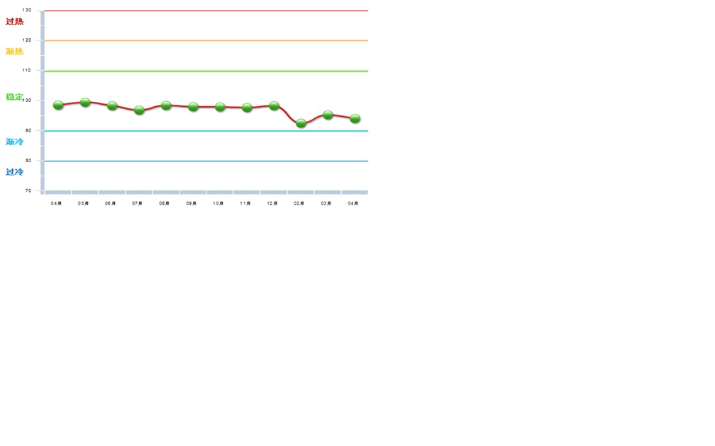发布2014年4月中轻家电景气指数。4月,中轻家电景气指数94.04,其中:主营业务收入景气指数为93.41,出口景气指数为91.37,资产景气指数为95.30,利润景气指数为95.35(图1)。