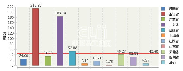 从地区利润增速情况看,浙江以213.23%的增速居全国第一位,其次是广东,增速为183.74% 。