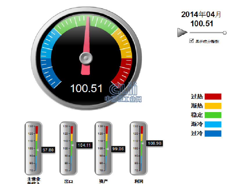 发布2014年4月中轻照明景气指数。4月,中轻照明景气指数100.51,其中:主营业务收入景气指数为97.80,出口景气指数为104.11,资产景气指数为99.06,利润景气指数为106.98(图1)。
