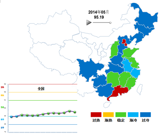 从分地区景气运行情况来看,5月份,北京、天津和广东3个地区处于“过热”区间,占全国地区总数(下同)的9.68%;山西、山东、江苏、湖南、福建和江西6个省处于 “稳定”区间,占全国的19.35%;安徽和浙江两省处于“渐冷”区间, 处于“过冷”区间的有黑龙江、吉林、辽宁、河北、河南、湖北、四川、贵州、广西共9个地区,占全国的29.03%。(图1-3)。