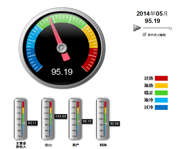 发布2014年5月中轻体育用品行业景气指数。5月,中轻体育用品景气指数为95.19,其中:主营业务收入景气指数为93.11,环比下降0.04个百分点;出口景气指数为104.60,环比下降2.37个百分点;资产景气指数为96.10,环比上升0.97个百分点;利润景气指数为92..06,环比下降4.40个百分点。(图1-1)