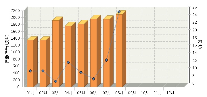 根据国家统计局公布数据,全国铅酸蓄电池行业累计完成产量15,305.73万千伏安时,同比增长14.33%。其中:8月份完成产量8月份完成产量2095.54万千伏安时,同比增长25.71%。2014年全国铅酸蓄电池行业月度产量及同比如下图所示。