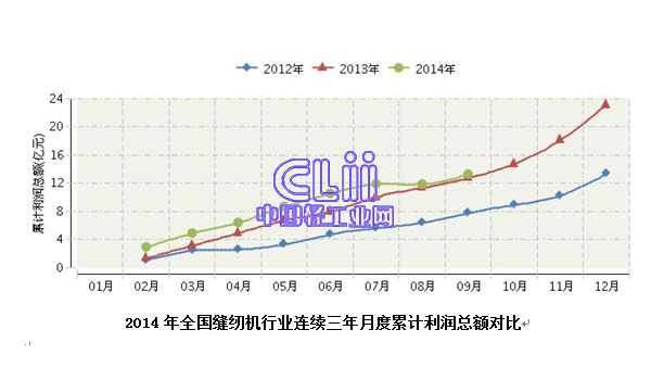 2014年1月~9月,全国缝纫机行业累计完成利润总额13.32亿元,同比增长0.74%。其中:1月~2月份完成累计利润总额2.96亿元,同比增长93.97%;1月~3月份完成累计利润总额4.92亿元,同比增长49.12%; 1月~9月份完成累计利润总额13.32亿元,同比增长0.74%。