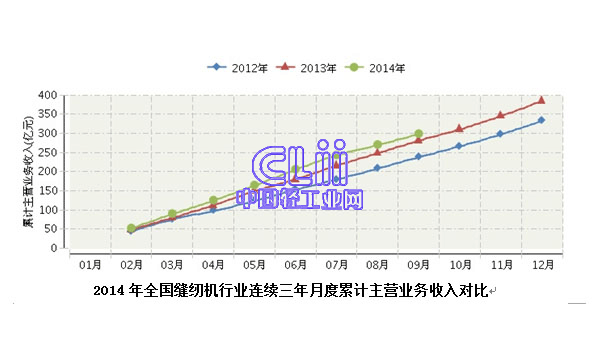 2014年1月~9月,全国缝纫机行业累计完成主营业务收入299.51亿元,同比增长4.91%。其中:1月~2月份完成累计主营业务收入52.7亿元,同比增长6.57%; 1月~9月份完成累计主营业务收入299.51亿元,同比增长4.91%。
