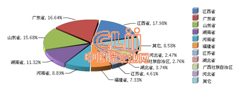 据国家统计局数据显示,2014年1~9月全国陶瓷行业规模以上企业累计完成主营业务收入前三位地区依次是江西、广东、山东。其中江西累计完成主营业务收入同比增长15.18%,占17.98%;广东累计同比增长19.39%,占16.64%;山东累计同比增长9.75%,占15.68%。详见图1。