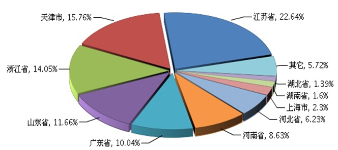 2014年1月~9月,全国自行车制造行业完成累计主营业务收入1,036.84亿元,同比增长10.12%。主要集中在江苏省、天津市、浙江省、山东省、广东省等地区,这5省市的比重占全国的74.15%(参见图5)。从增长情况来看,除湖南省基数较小,体现出较高的增速,达到123.03%,其他各省份的增长速度均有不同程度放缓。(参见图3)。