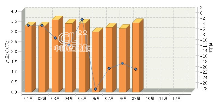 2014年1~9月,全国规模以上照明企业白炽灯泡累计产量较去年同期有所下降,同比增长-5.54%。进入2014年,各月产量增速均为负增长,其中:9月份产量同比增长-19.5%。