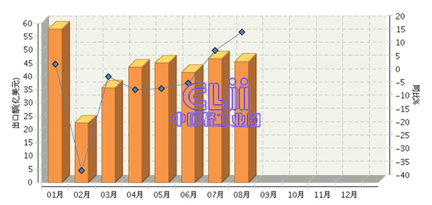 根据海关总署数据显示,2014年1~8月,我国家具的累计出口值在轻工主要商品出口中占8.78%,仍居第五位;家具出口值累计同比下降1.33%,比轻工主要出口商品的平均水平低了9.85个百分点,虽然出口值增速继续为负,但降幅进一步收窄。8月出口值再次回落,而当月增速快速提升,同比增长16.73%(图2和图3)。