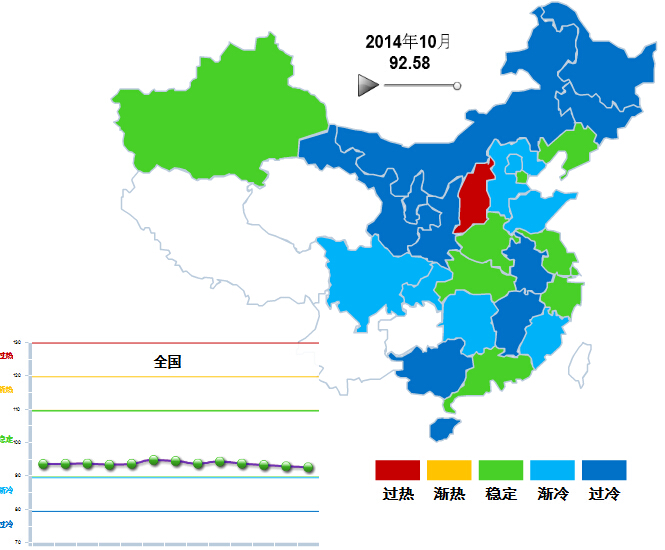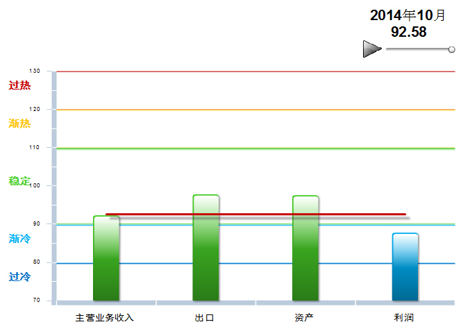 2013年9月至2014年10月,中轻皮革景气指数基本稳定,在90~100间小幅波动,处于稳定提示区的下半区运行。10月中轻皮革景气指数略低于9月(参见图3)。