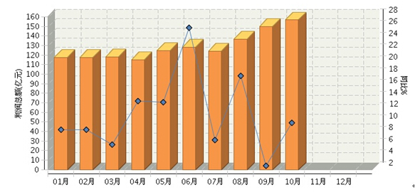 根据国家统计局公布数据,2014年1月~10月,全国食品行业累计完成利润总额1,289.19亿元,同比增长11.06%。其中:10月份完成利润总额156.63亿元,同比增长10%。2014年月度数据走势及同比增长情况如下图所示。