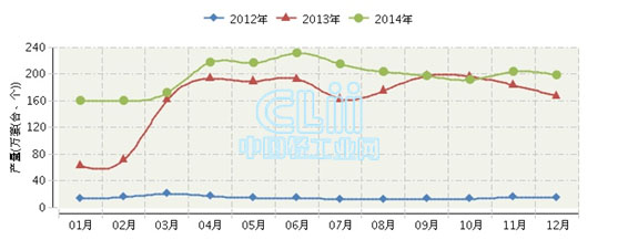 2014年河南灯具及照明装置行业连续三年月度产量对比