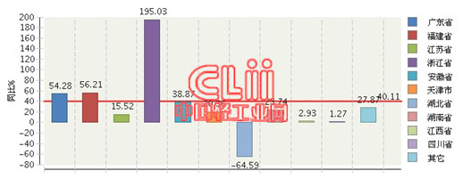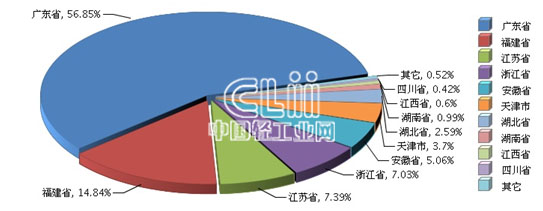 2015年1~2月,全国发光二极管(LED)累计产量同比增长40.11%。比重主要集中在广东、福建、江苏、浙江和安徽等地区。其中:广东累计产量占全国总产量的56.85%;福建累计产量占全国总产量的14.84%;江苏累计产量占全国总产量的7.39%。