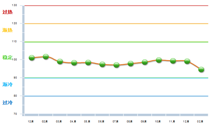图1 2013.12—2015.2自行车行业主营业务收入景气指数变化态势