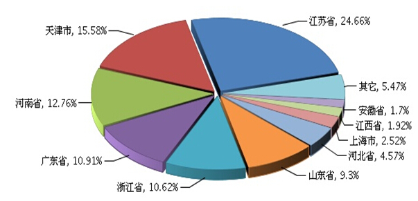 2015年1月~2月,全国自行车制造行业完成累计主营业务收入174.63亿元,同比增长2.24%。主要集中在江苏省、天津市、河南省、广东省、浙江省等地区,这5省市的比重占全国的74.53%(参见图3)。从增长情况来看,江西省由于去年基数较小,增速最高,达到63.42%,其次,河南省、安徽省等地区也体现了较高增速,但增速普遍低于去年同期水平。